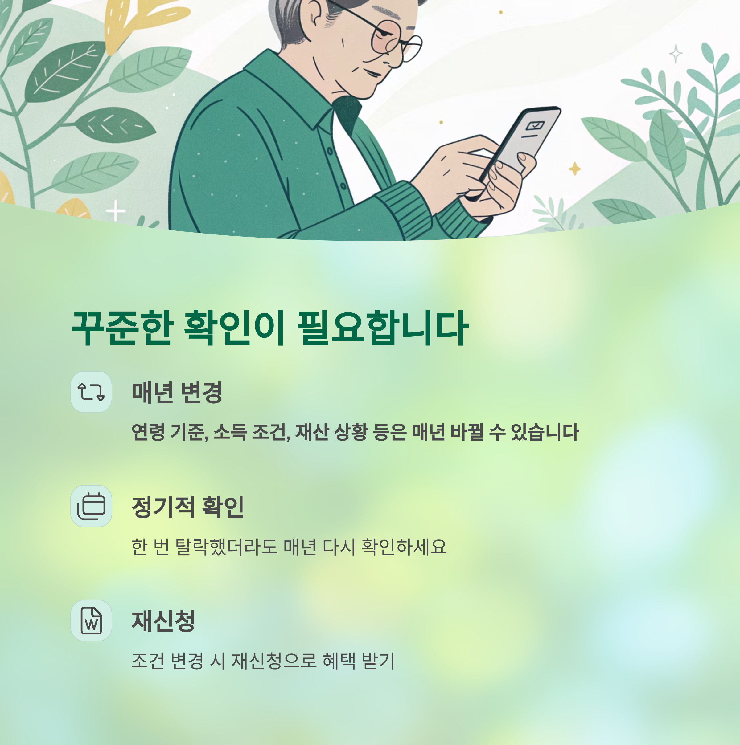 연령 기준, 소득 조건, 재산 상황 등은 매년 바뀔 수 있습니다