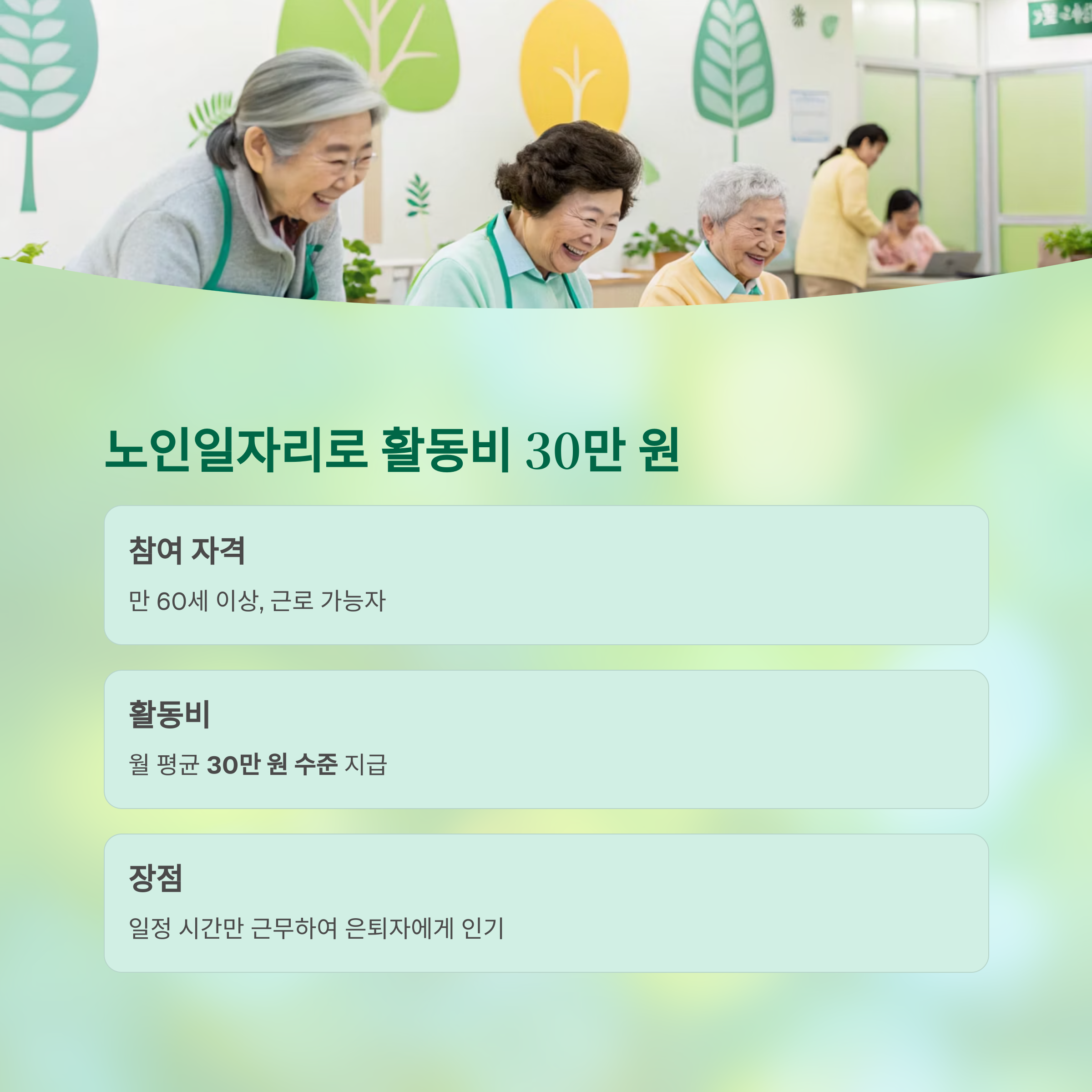 | 노인일자리 | 약 30만 원 | 만 60세 이상, 근로 가능자 |