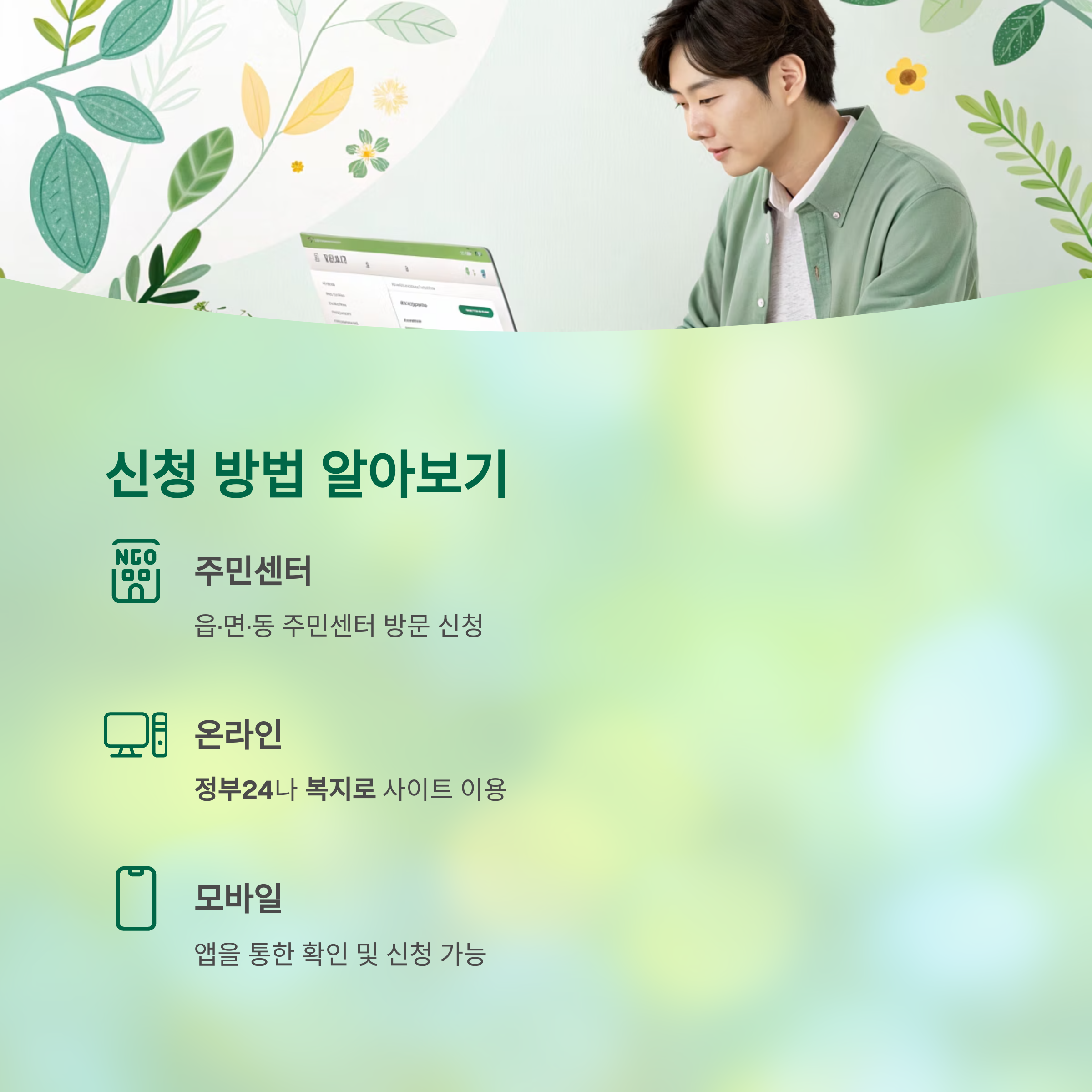 대부분의 제도는 읍·면·동 주민센터, 국민연금공단, 복지로 홈페이지 등을 통해 신청 가능합니다