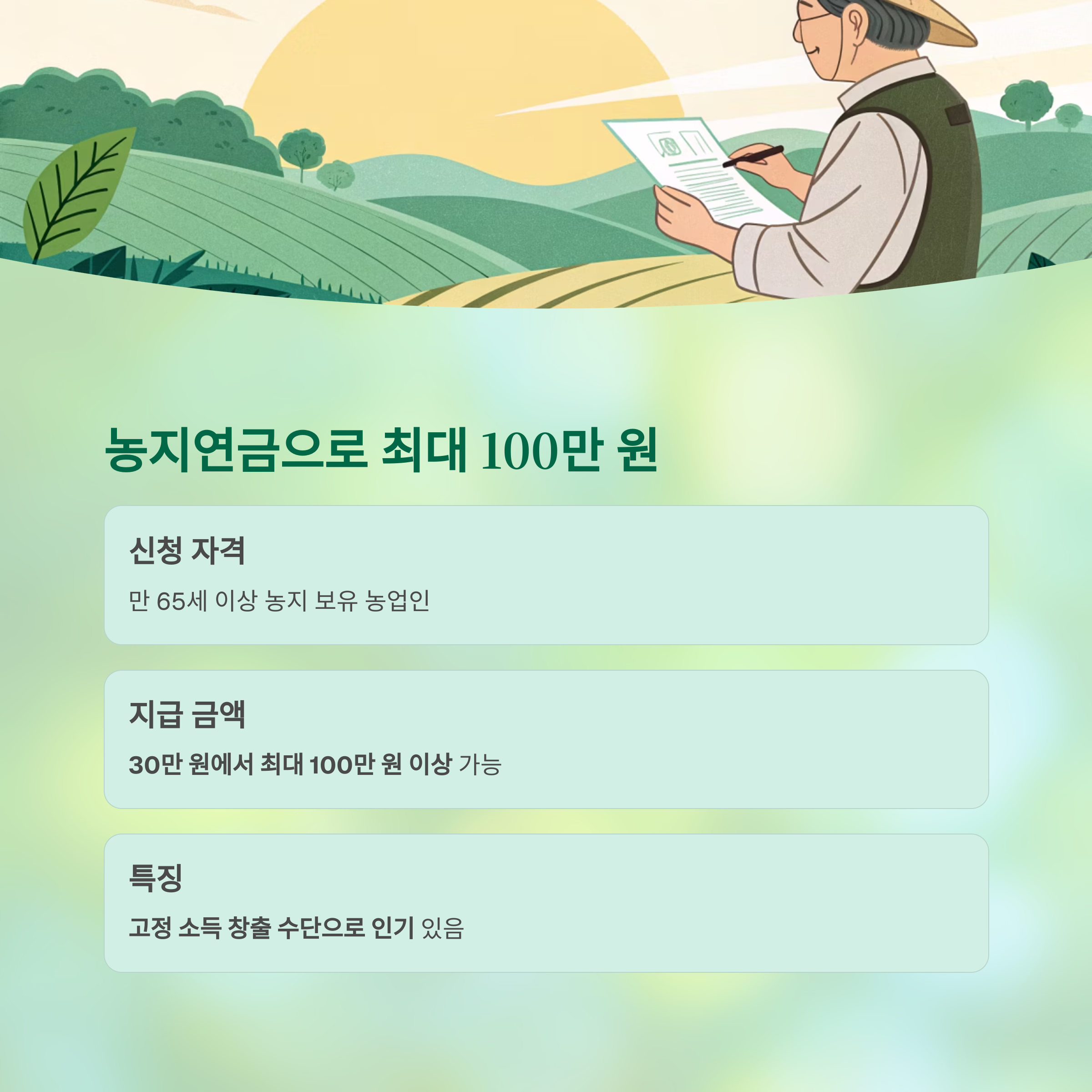 | 농지연금 | 30만 ~ 100만 원 | 만 65세 이상, 농지 보유 |