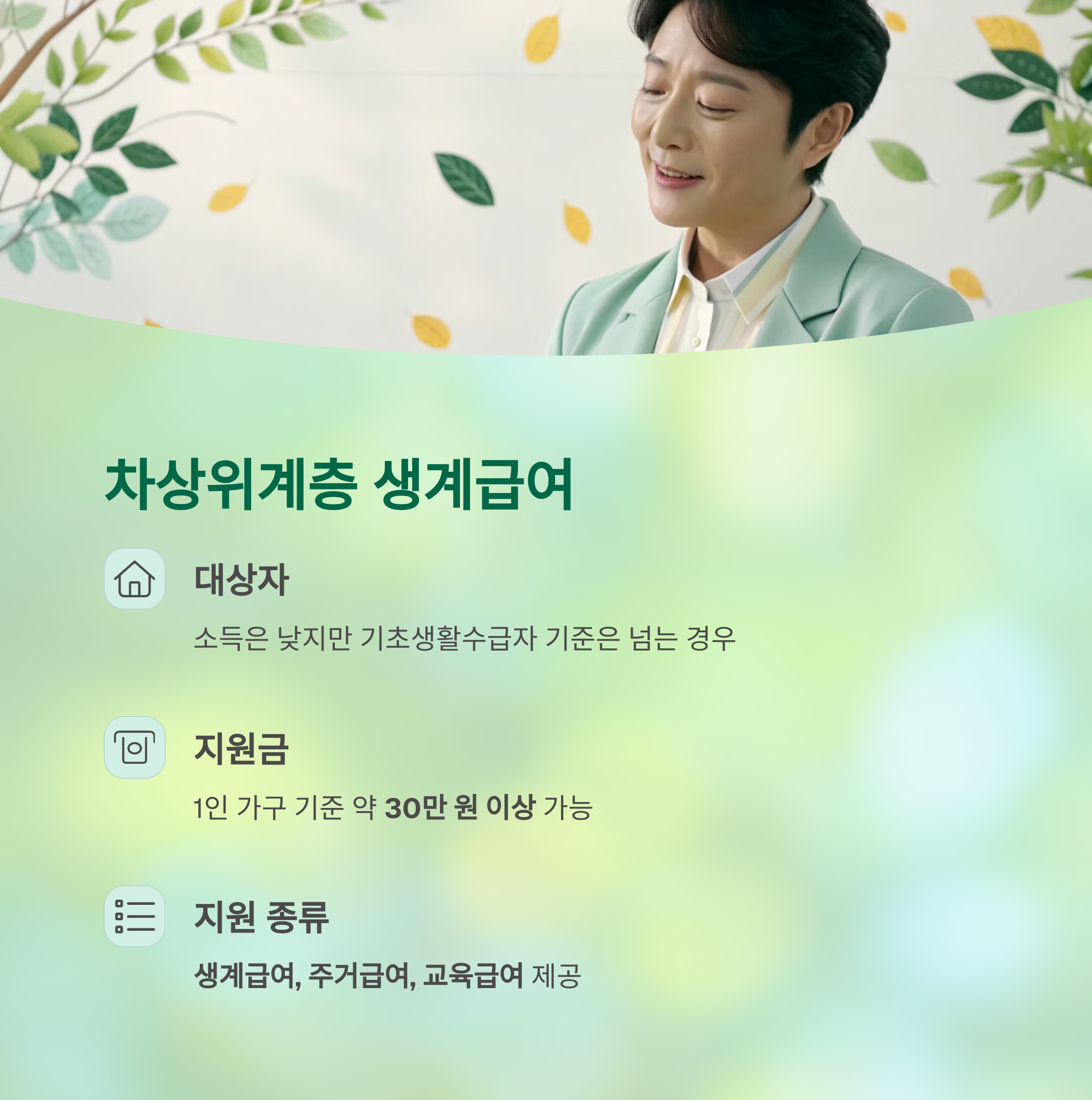 | 생계급여(차상위) | 약 30만 원 이상 | 소득 기준 충족 시 |