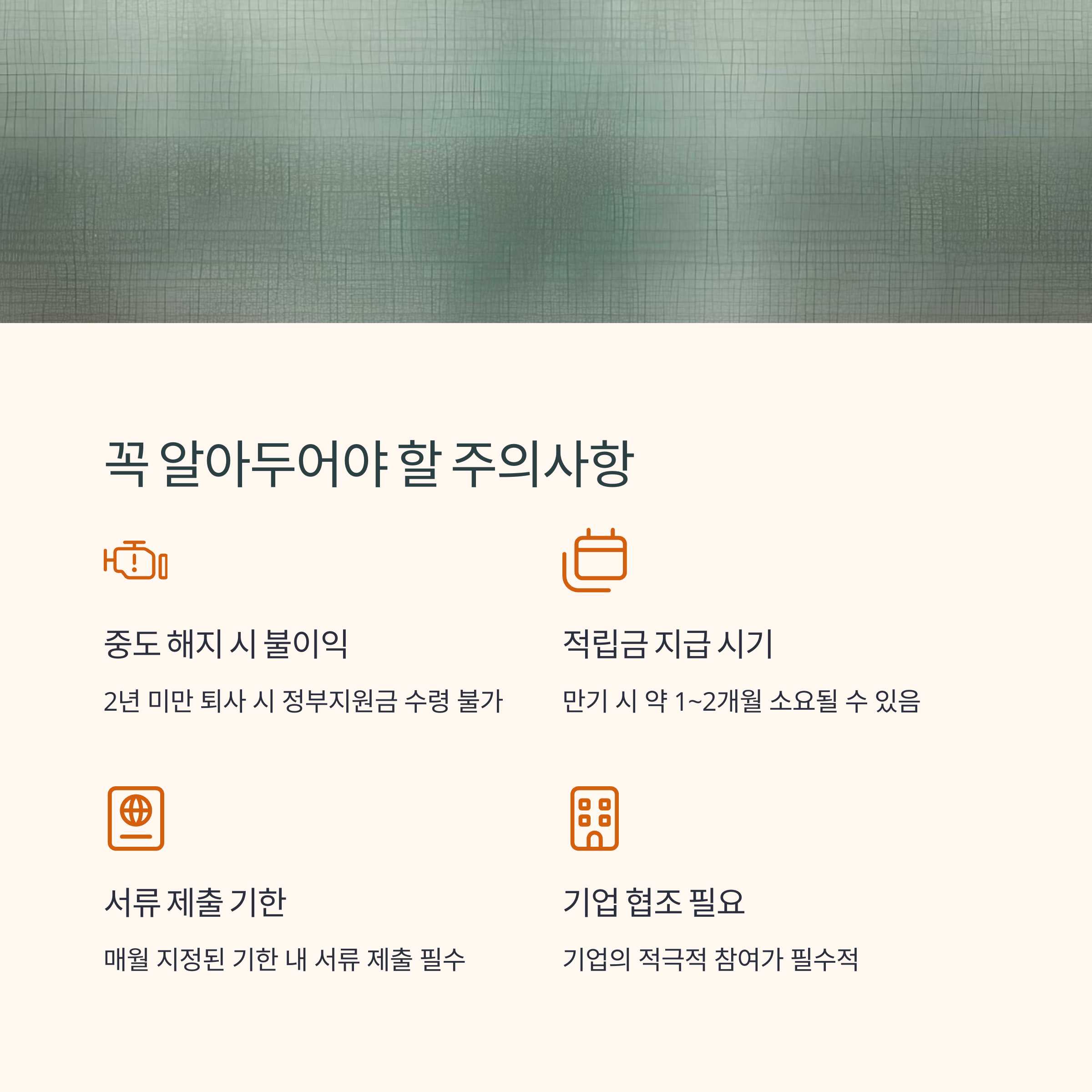 예를 들어 1년 근무 후 퇴사하게 되면, 그동안 납입한 금액(150만 원)은 돌려받을 수 있지만, 기업과 정부의 지원금은 모두 몰수된다는 뜻이에요. 이건 실질적인 손해로 다가올 수밖에 없죠.