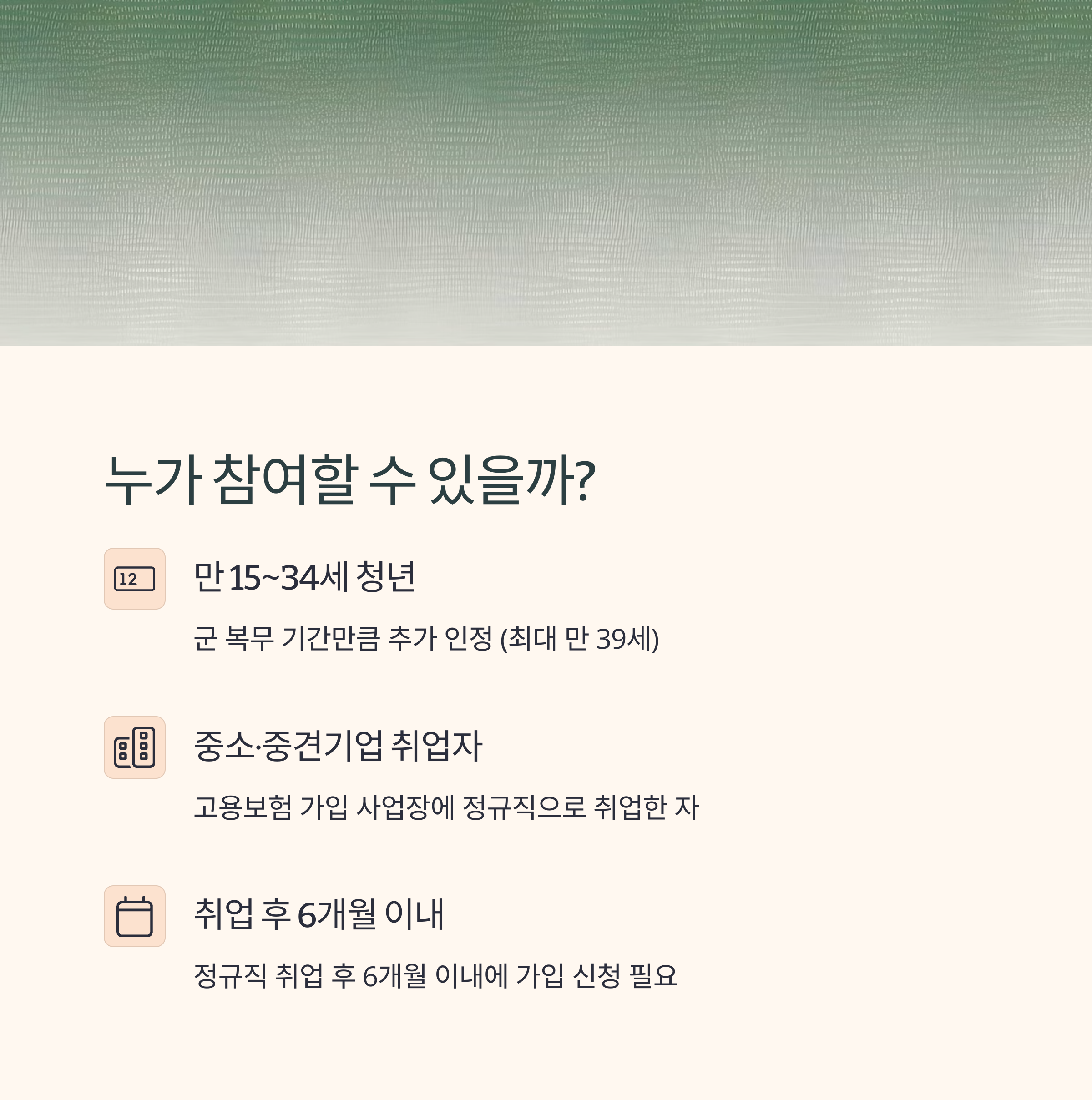 또한 소득이 월 평균 300만 원 이하인 경우에만 가입이 가능하고, 병역 이행자는 최대 6년까지 가입 나이 제한이 연장돼요. 고졸자도 입사 후 일정 교육만 이수하면 참여할 수 있어요.