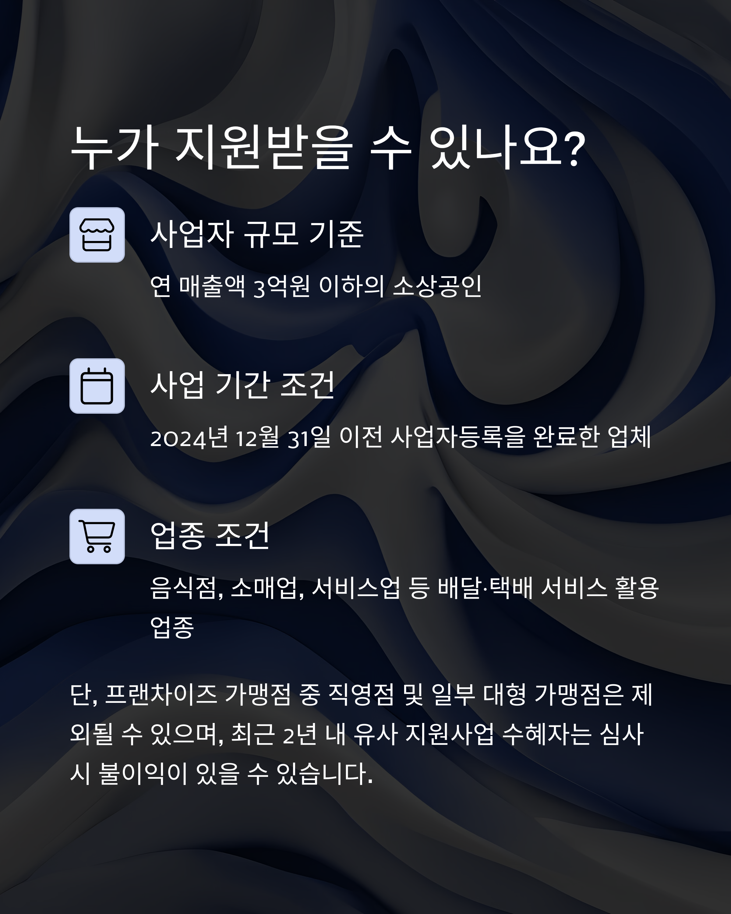 지원 대상은 크게 두 가지로 나뉘어요. 첫 번째는 자체 배송 또는 민간 배달앱(배달의민족, 쿠팡이츠 등)을 통해 서비스를 운영하는 외식업종이에요. 두 번째는 온라인몰 또는 스마트스토어 등을 통해 제품을 택배로 판매하는 제조·유통 소상공인들이에요.