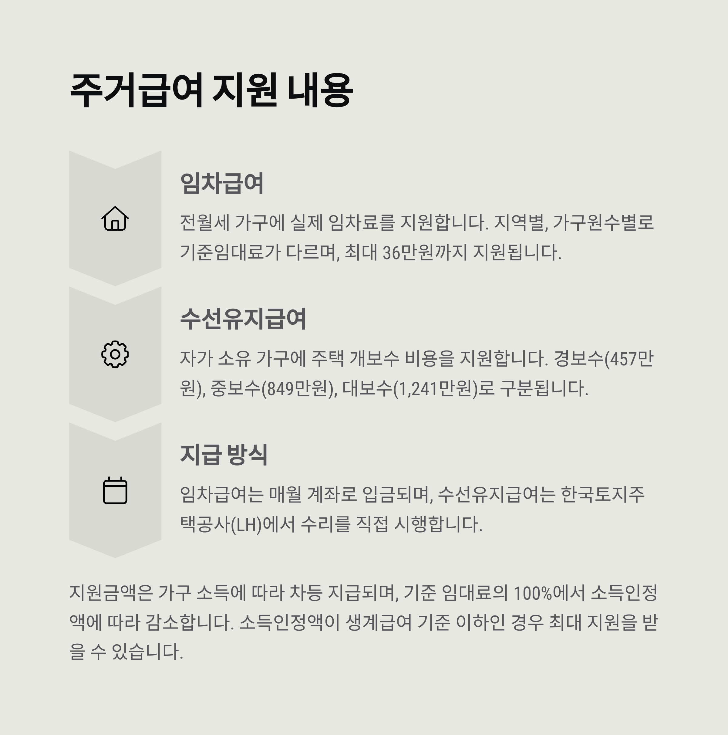 임차급여는 매달 임대료를 보조해주는 형식으로, 전세나 월세로 거주하는 분들이 대상이에요. 수선유지급여는 자가에 살고 있지만, 집 상태가 열악할 경우 개보수를 지원해주는 제도예요. 60대 이상이면서 무주택인 경우에는 주로 임차급여가 해당돼요.