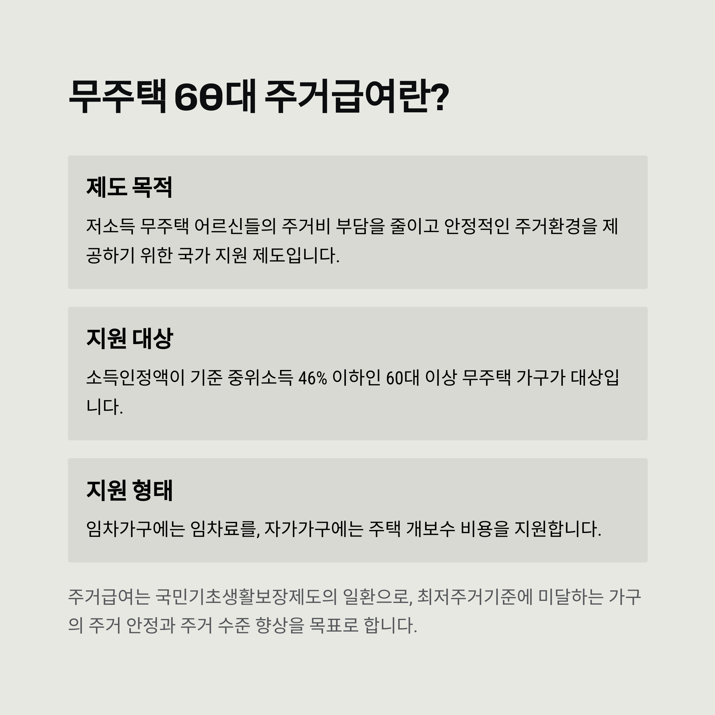 주거급여는 정부에서 저소득층 가구에 대해 주거비 일부를 보조해주는 제도예요. 그중에서도 60세 이상 무주택 고령자에게는 더욱 집중된 지원이 이루어지고 있어요. 이는 국민기초생활보장제도의 일환으로, 보건복지부에서 시행하고 있답니다.