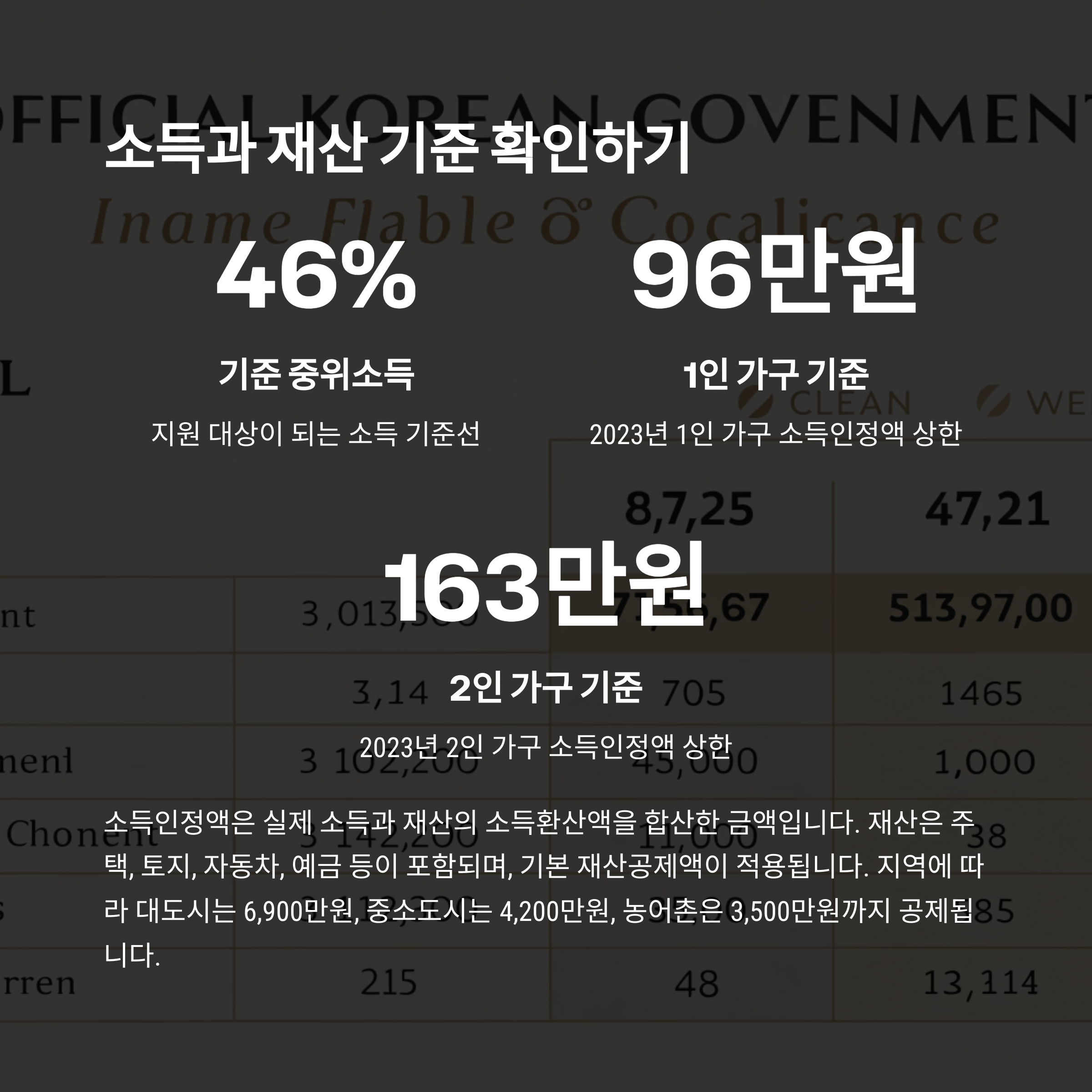 만약 재산이 일정 금액을 넘는다면 '재산의 소득환산율'을 적용하게 되는데, 이때는 월소득으로 환산해서 계산해요. 예를 들어 현금이 3천만 원 있다면, 약 5% 정도 환산율을 적용해서 12개월로 나누면 매달 12만 원 정도의 소득으로 계산돼요.