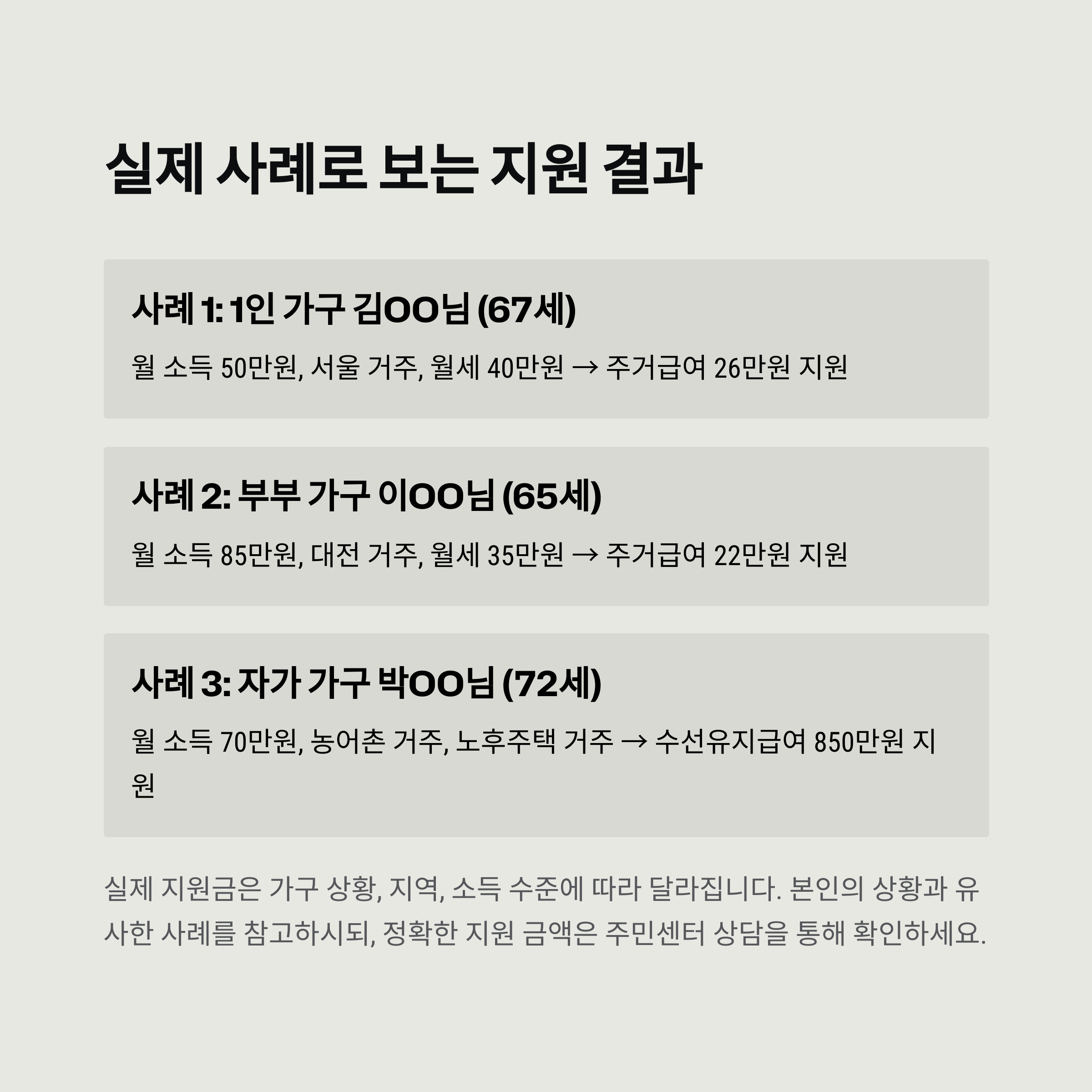 실제 사례를 보면, 주거급여가 얼마나 실질적인 도움이 되는지 실감할 수 있어요. 특히 무주택 60대 분들은 적은 연금이나 기초생활로 생활을 이어가는 경우가 많은데요, 매달 20만~30만 원의 주거비 지원은 생활의 질을 완전히 바꿔줄 수 있답니다.