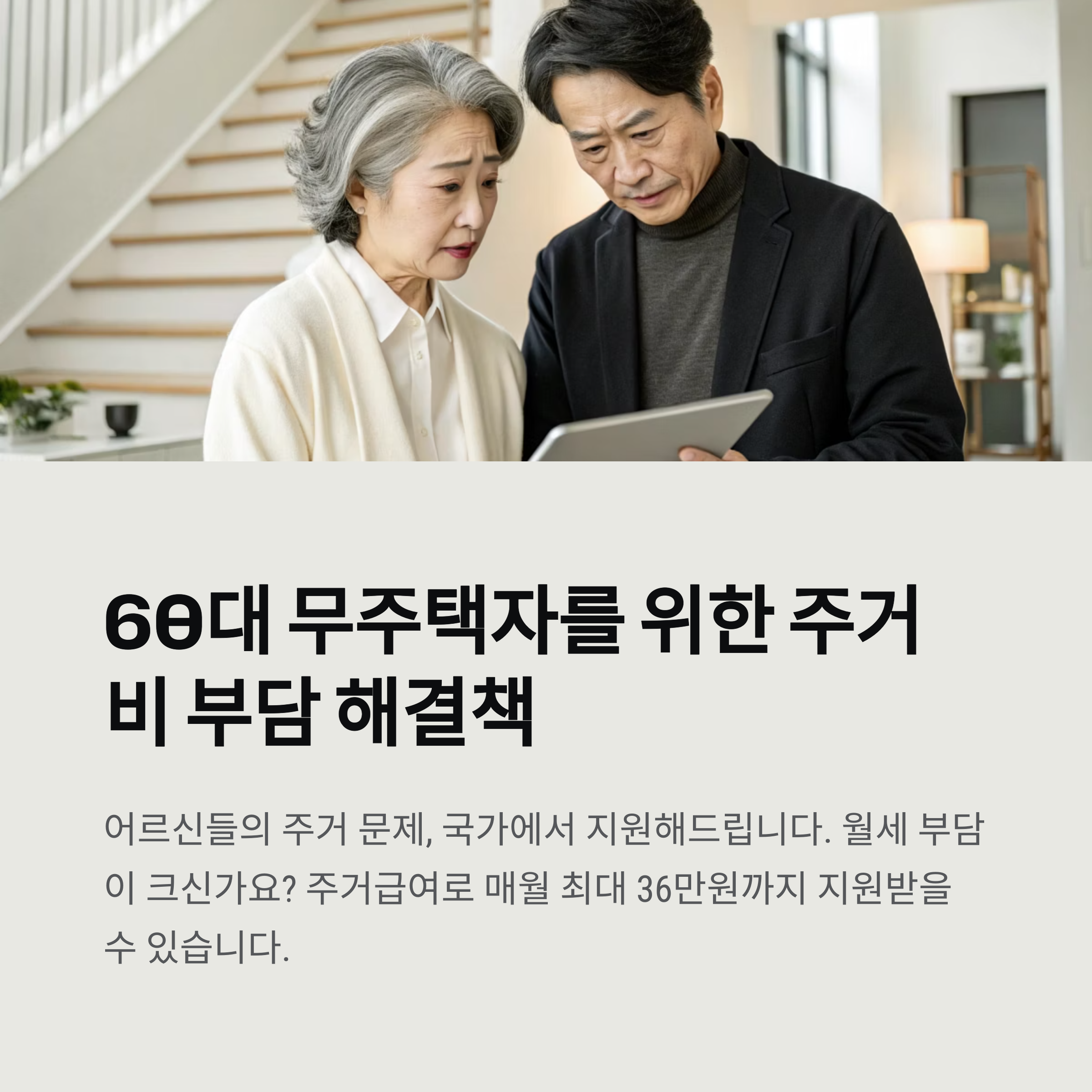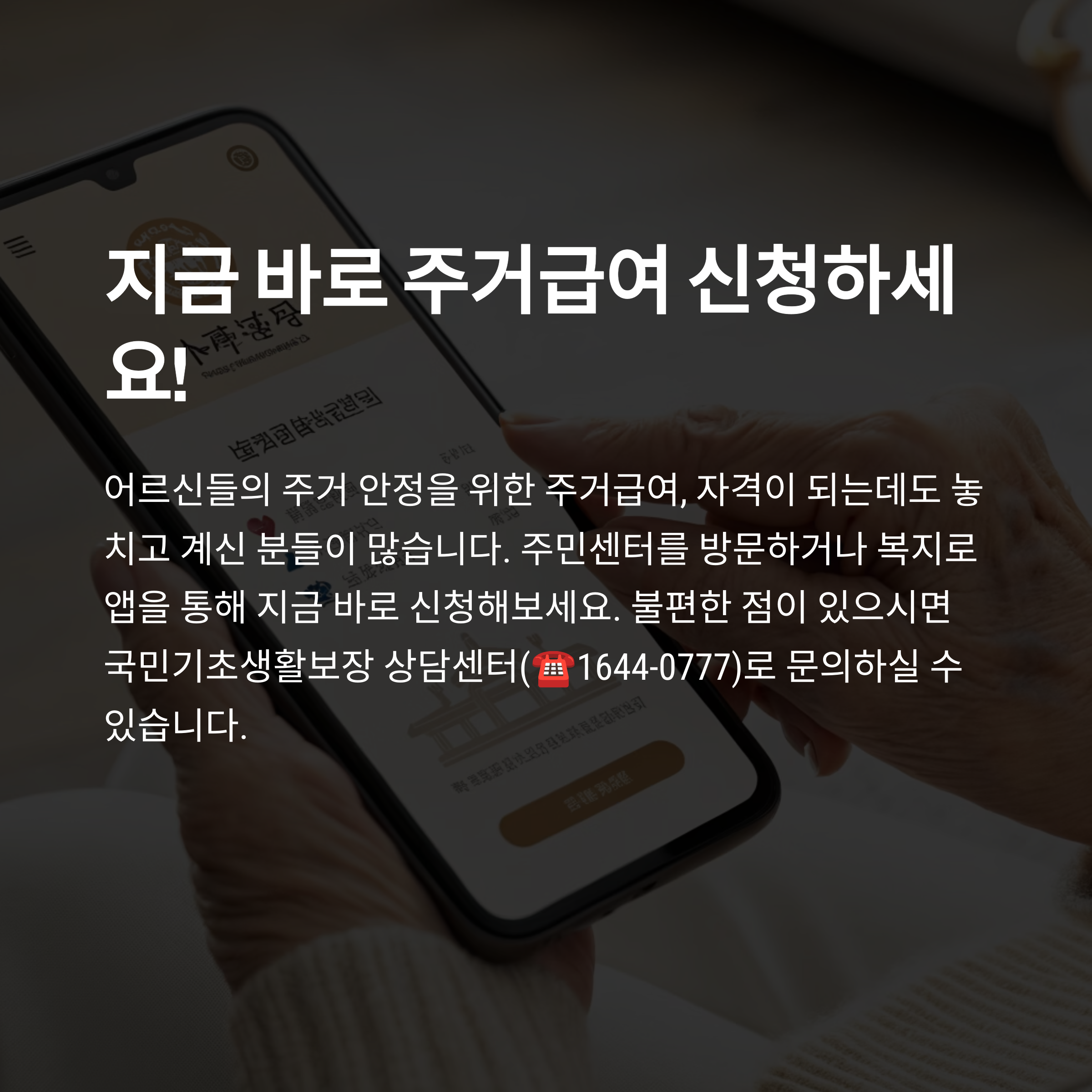 "60대 무주택자라면, 매달 35만원까지 집세를 지원받을 수 있어요! 신청 방법은 너무 간단해요!"