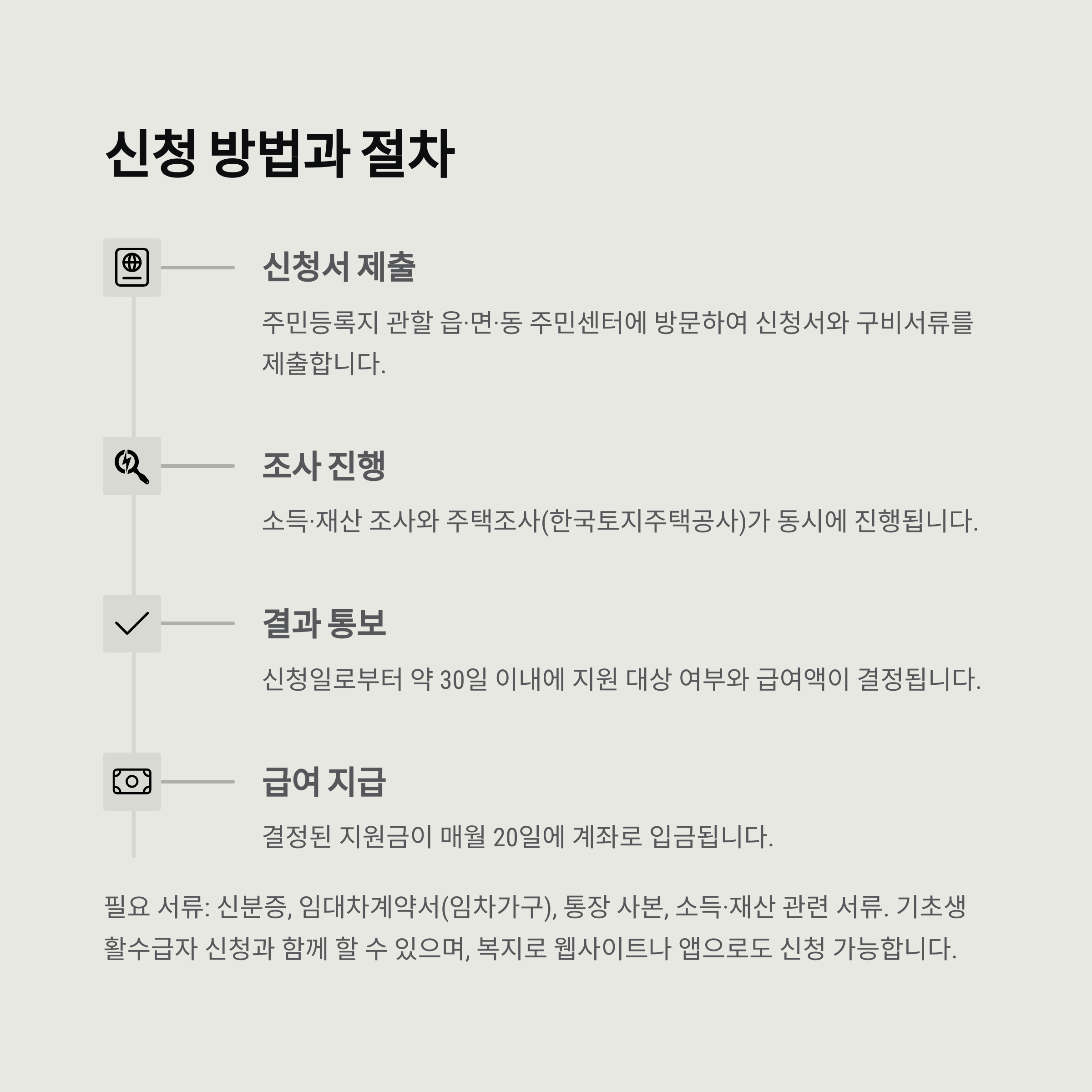 정부가 운영하는 행복e음 시스템을 통해 신청할 수 있으며, 주민센터를 통해서도 가능해요. 신청 후 시·군·구에서 소득, 재산, 주거 형태 등을 조사한 뒤 급여 대상자를 결정하게 돼요. 조사 후 1개월 이내에 결과가 통보되고, 지원이 시작돼요.