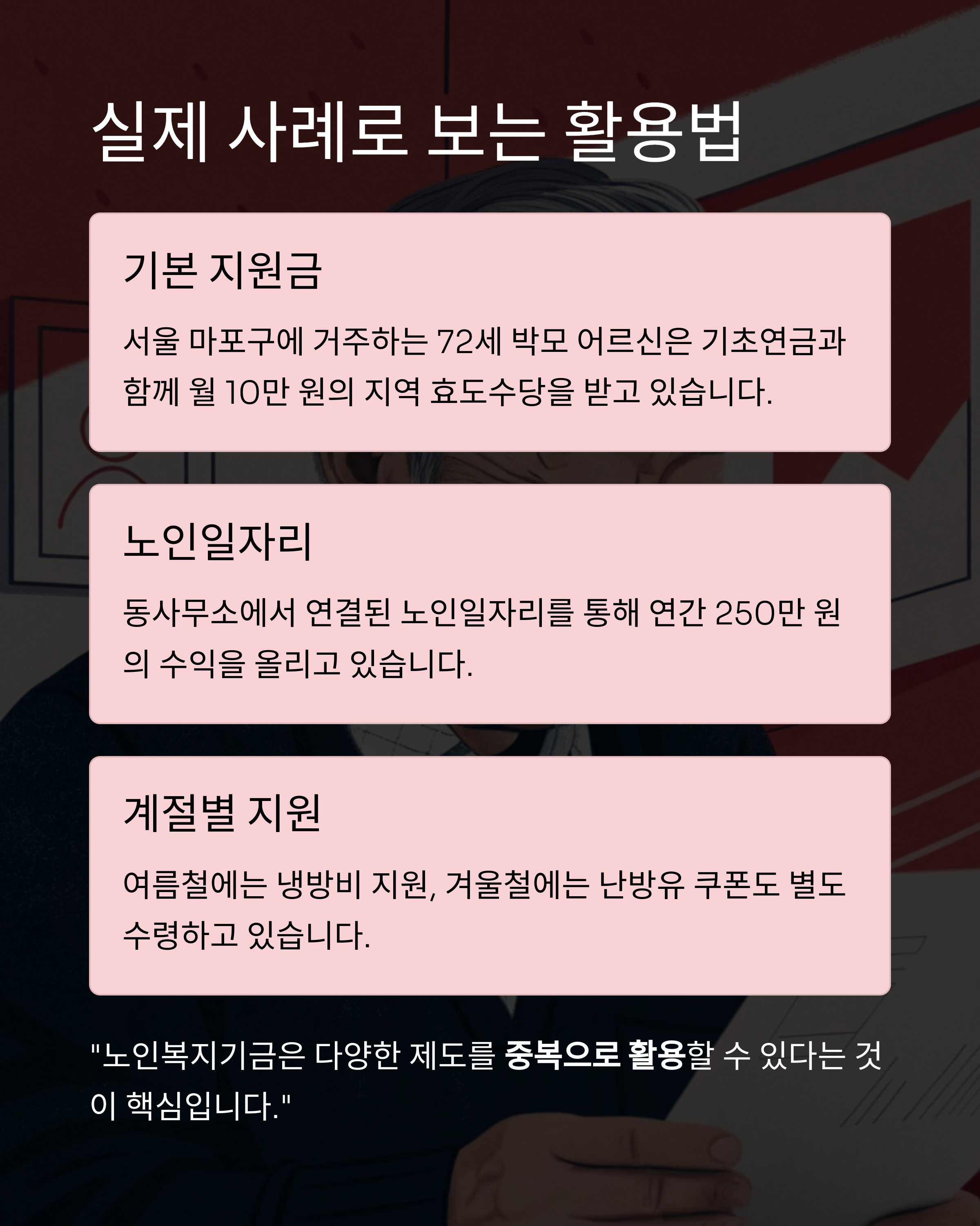 "노인복지기금은 다양한 제도를 중복으로 활용할 수 있다는 것이 핵심입니다."