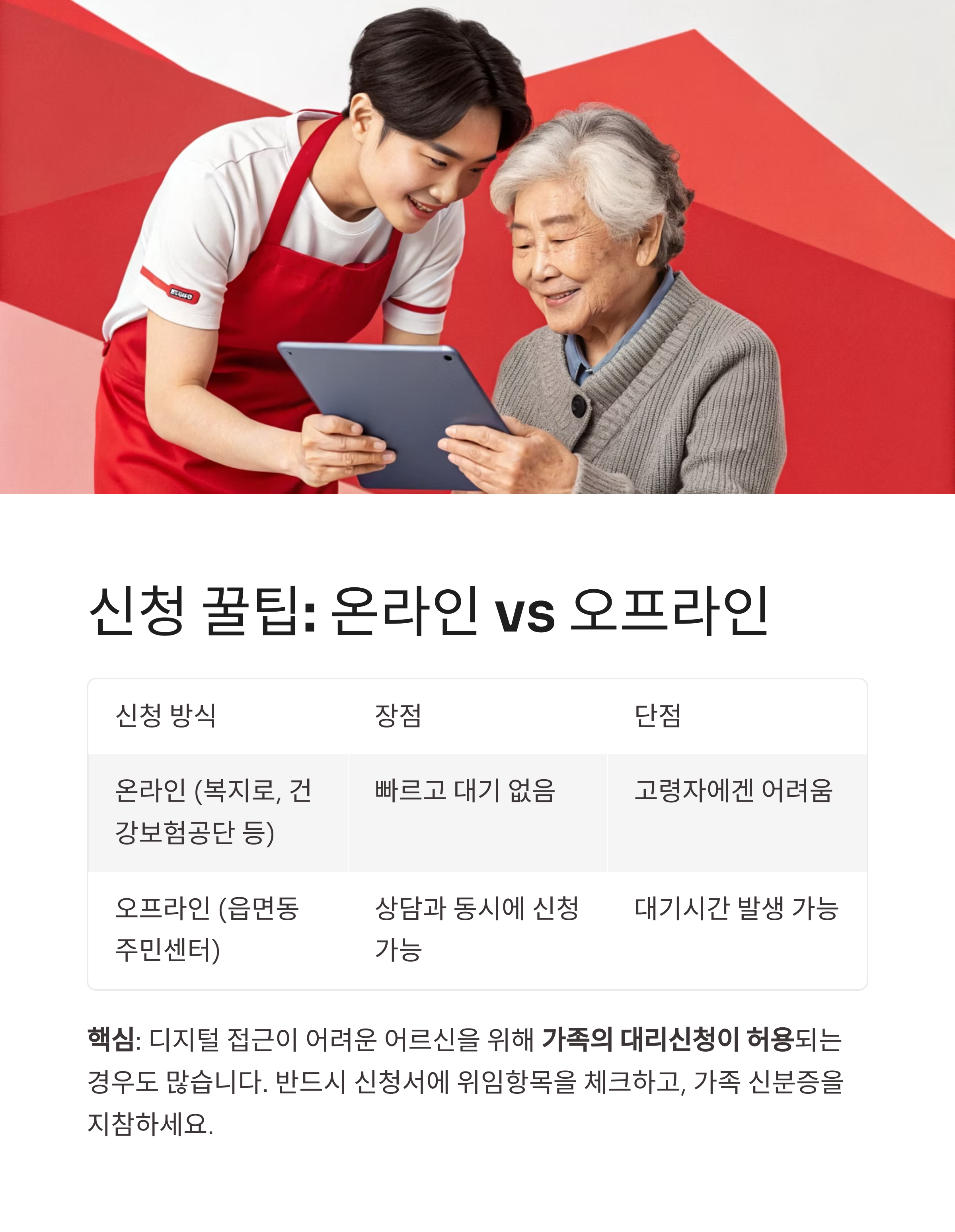 핵심: 디지털 접근이 어려운 어르신을 위해 가족의 대리신청이 허용되는 경우도 많습니다.