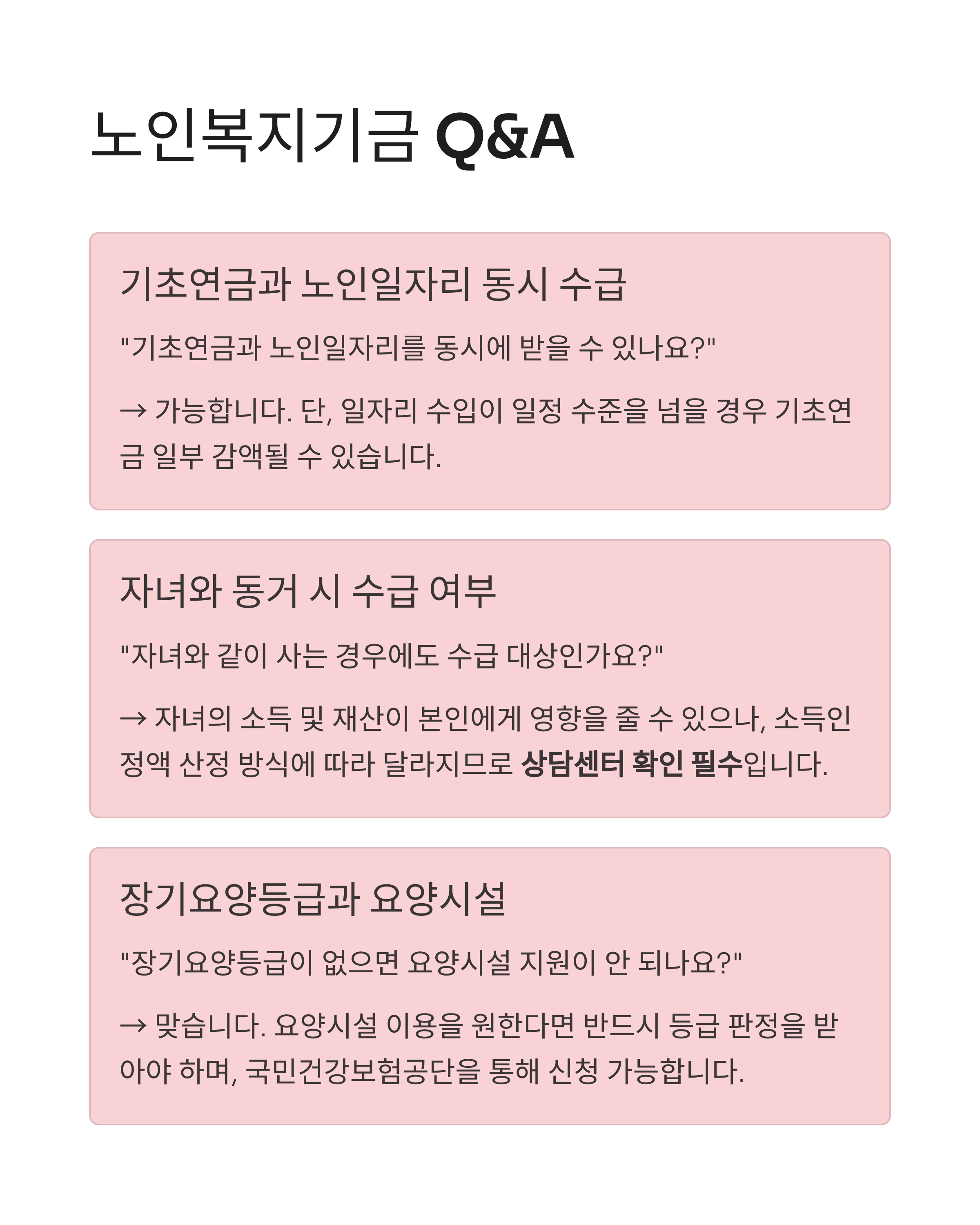 | 기초생활수급자 노인 | 생계비, 의료비, 주거비 등 종합 지원 | 선정 기준 충족 시 | 복지로 또는 주민센터 |