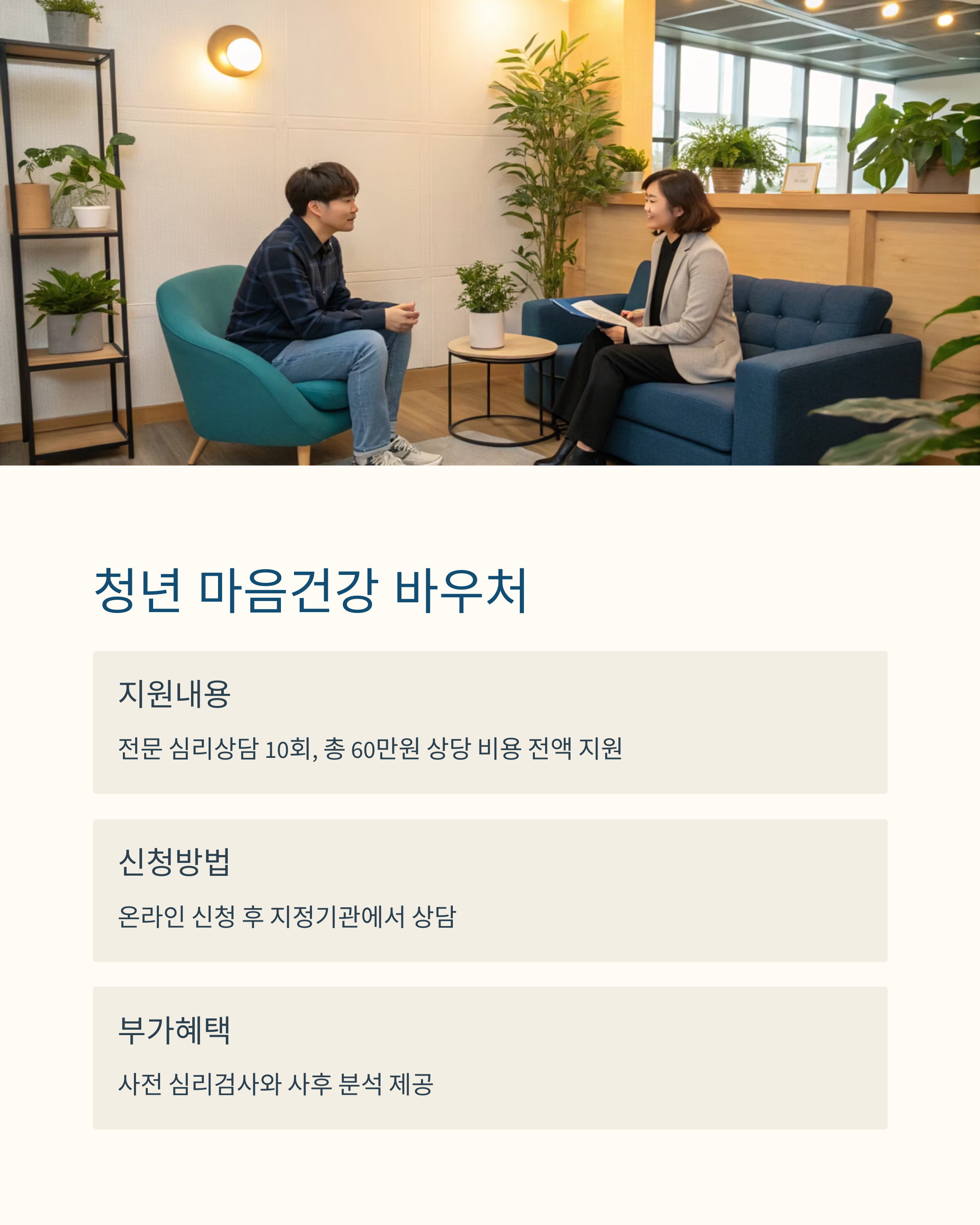 | 마음건강 바우처 | 만19~34세 이하 | 심리상담 10회 지원 | 최대 60만 원 |