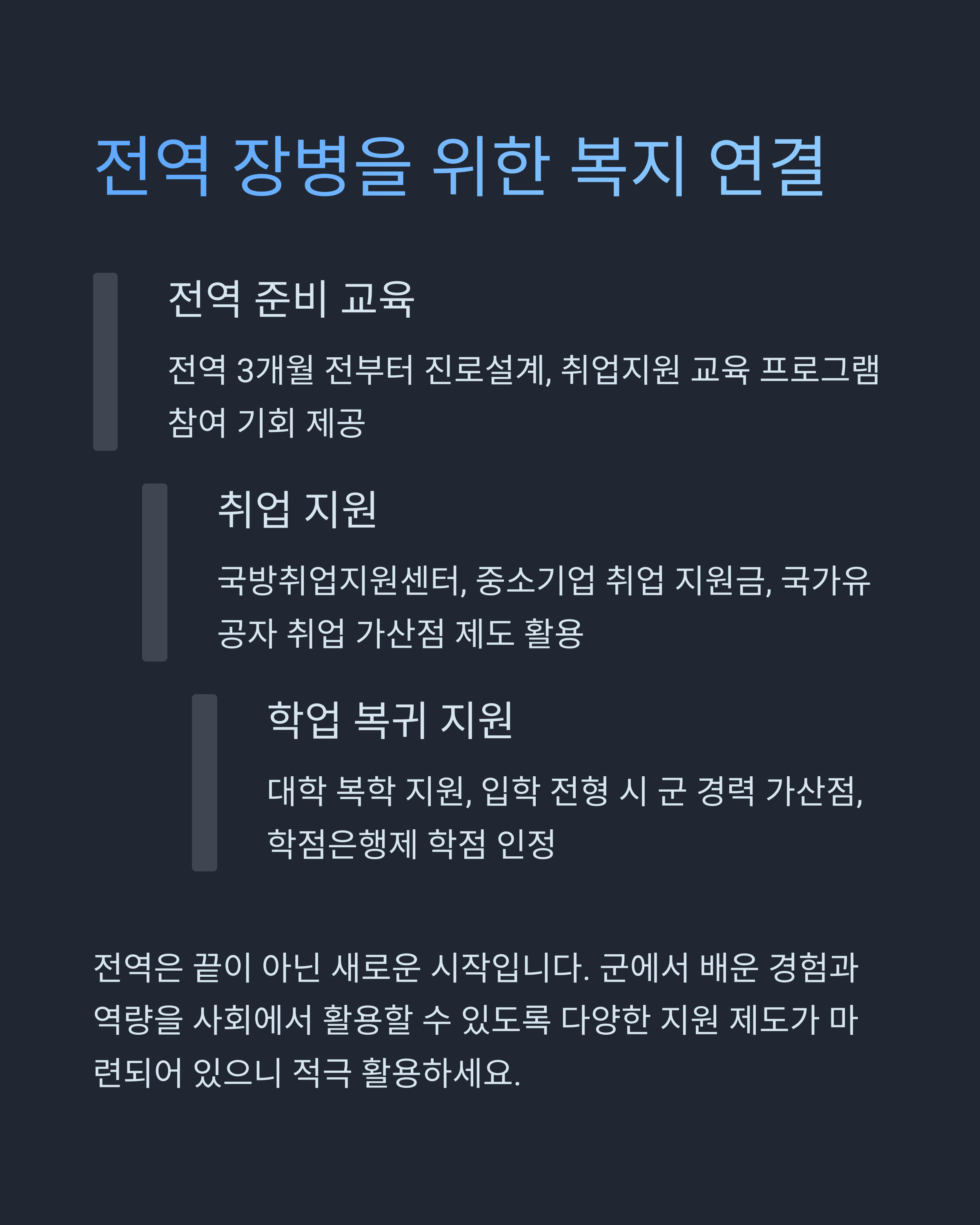 군 복무가 끝났다고 해서 복지 혜택이 딱 끊기는 건 아니에요. 오히려 전역 이후가 더 중요할 수 있죠. 그래서 전역 장병을 위한 연계 복지 프로그램이 아주 잘 구축되어 있어요. 국방부, 고용노동부, 병무청이 함께 운영하는 ‘전역지원제도’가 대표적이에요.