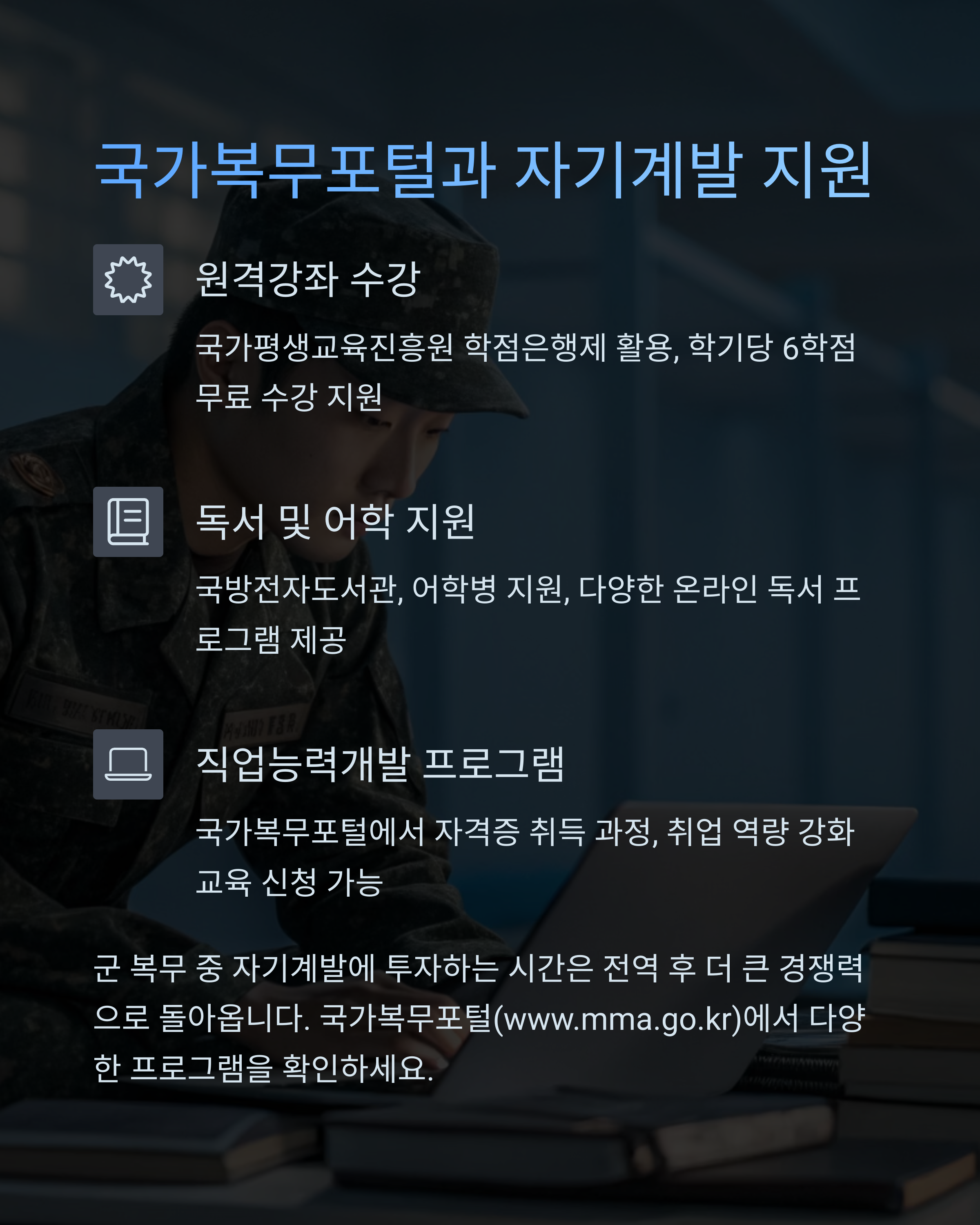 군 복무 중에도 개인의 발전을 위한 시간으로 활용할 수 있다는 사실, 알고 있었나요? 요즘엔 장병들을 위한 다양한 자기계발 프로그램이 운영되고 있어요. 대표적인 것이 ‘국가복무포털’인데요, 여기를 통해 온라인 강좌, 자격증 준비, 대학 연계 학습 등을 손쉽게 이용할 수 있어요.